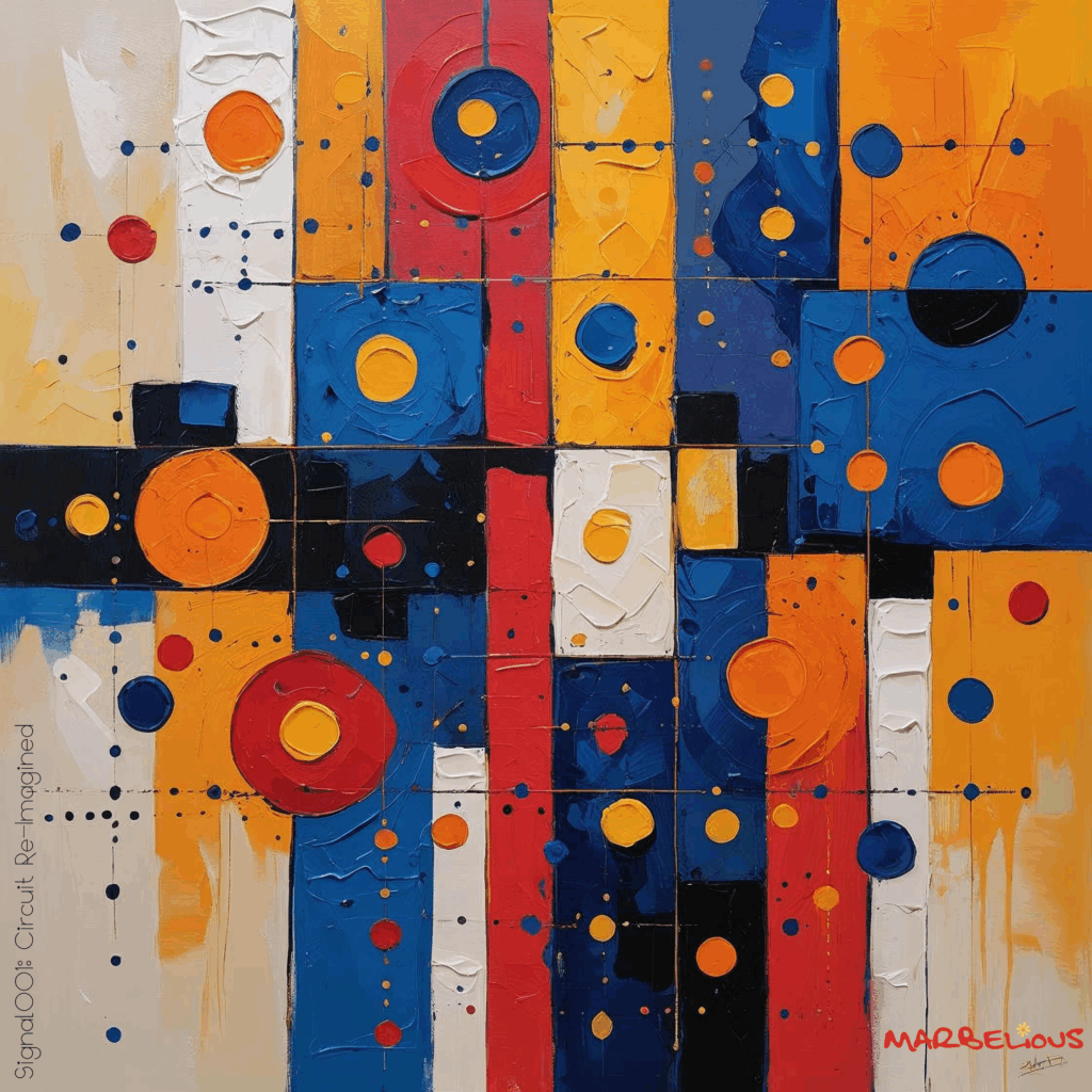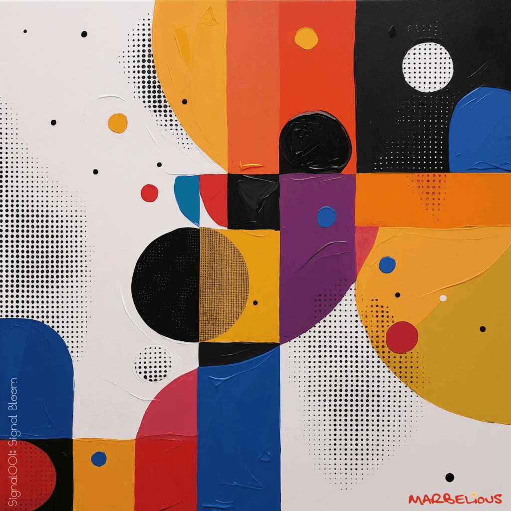 This collection explores the essence of abstract signals through geometric shapes and vibrant primary colours. Rendered with the texture and warmth of imagined oil paint, each piece layers structured forms, black dot overlays, and mesh grid elements to evoke echoes of forgotten transmissions.