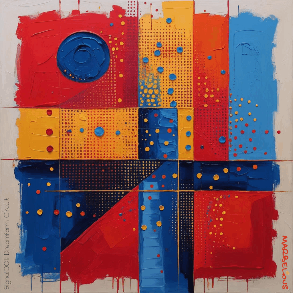 “Geometric abstract imagined oil painting with structured forms, red/blue/yellow palette, black dot overlays, and grid-mesh elements — evokes a signal echo from a forgotten world.”